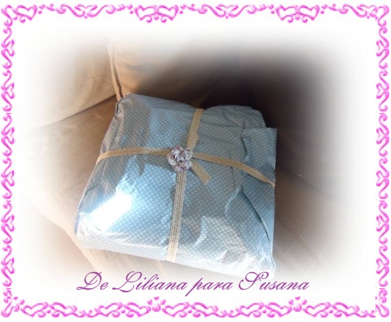 Mi regalo lo recibì de mi amiga Liliana , mi querida MISS, una mujer que tiene unas manos de oro,,,como trabaja la tia ¡¡¡ ,,,,me encanto su regalo, un cojìn precioso de patch, una bolsita con un transfer llena de frutas de Aragòn que ricas ¡¡¡. Muchas gracias Lili....eres un sol.